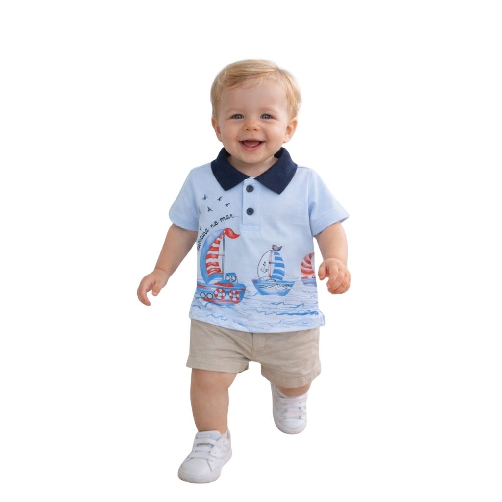 Prepare seu pequeno para viver grandes aventuras com muito estilo. A Camisa Polo Estampada de Barcos para Bebês Meninos é a escolha ideal para quem busca conforto, charme e praticidade em uma única peça.