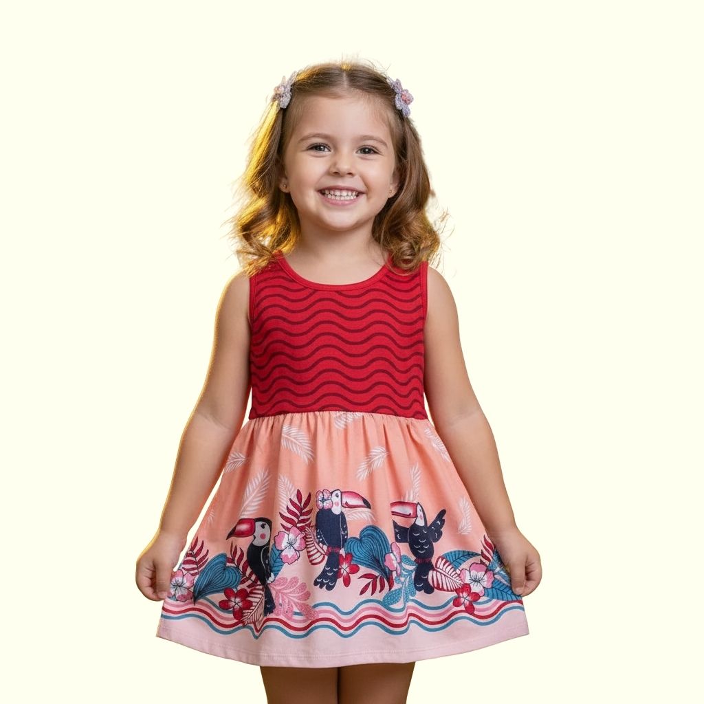 O Vestido Infantil Menina Tucano traz uma estampa vibrante, cheia de vida e personalidade, que encanta à primeira vista e conquista pelo conforto absoluto.
